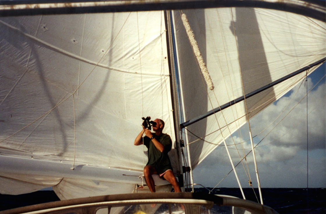 up behind us, wheel in my hand, our sails winged out in front of me